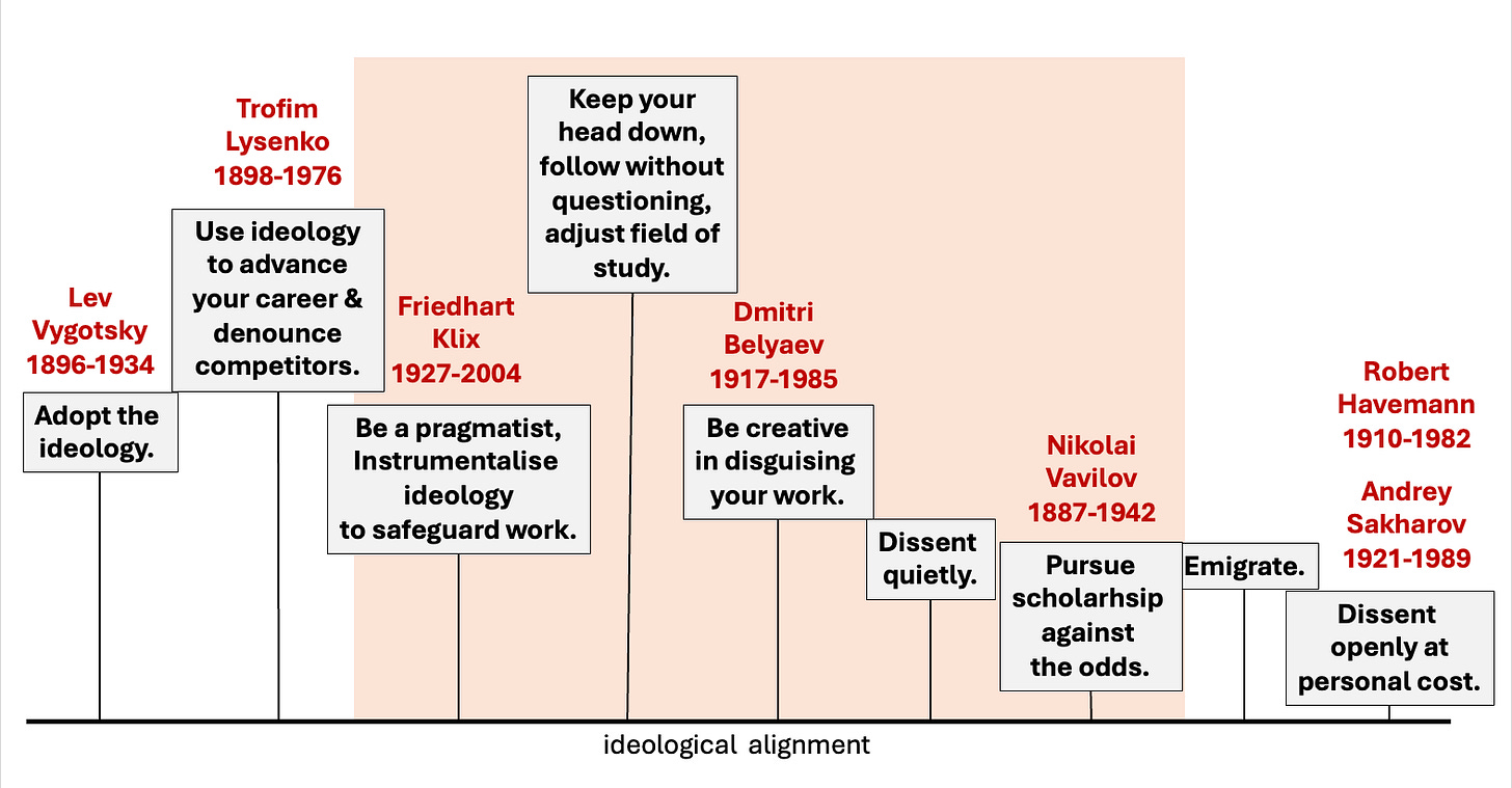 Without doubt, the specifics of my categorisation can be debated and refined with deeper historical knowledge. Yet even this broad and approximate categorisation offers some insight into how integrity of scholarship might be preserved. I will therefore conclude with a brief list of options that existed in the middle of the continuum of ideological alignment (the orange area in Figure 1) and explore potential parallels to the present.—If one is unwilling to embrace the new masters, unable to leave, and finds open dissent too great a risk, can the past offer any guidance on what remains possible? The following list expands on some of the points made above.